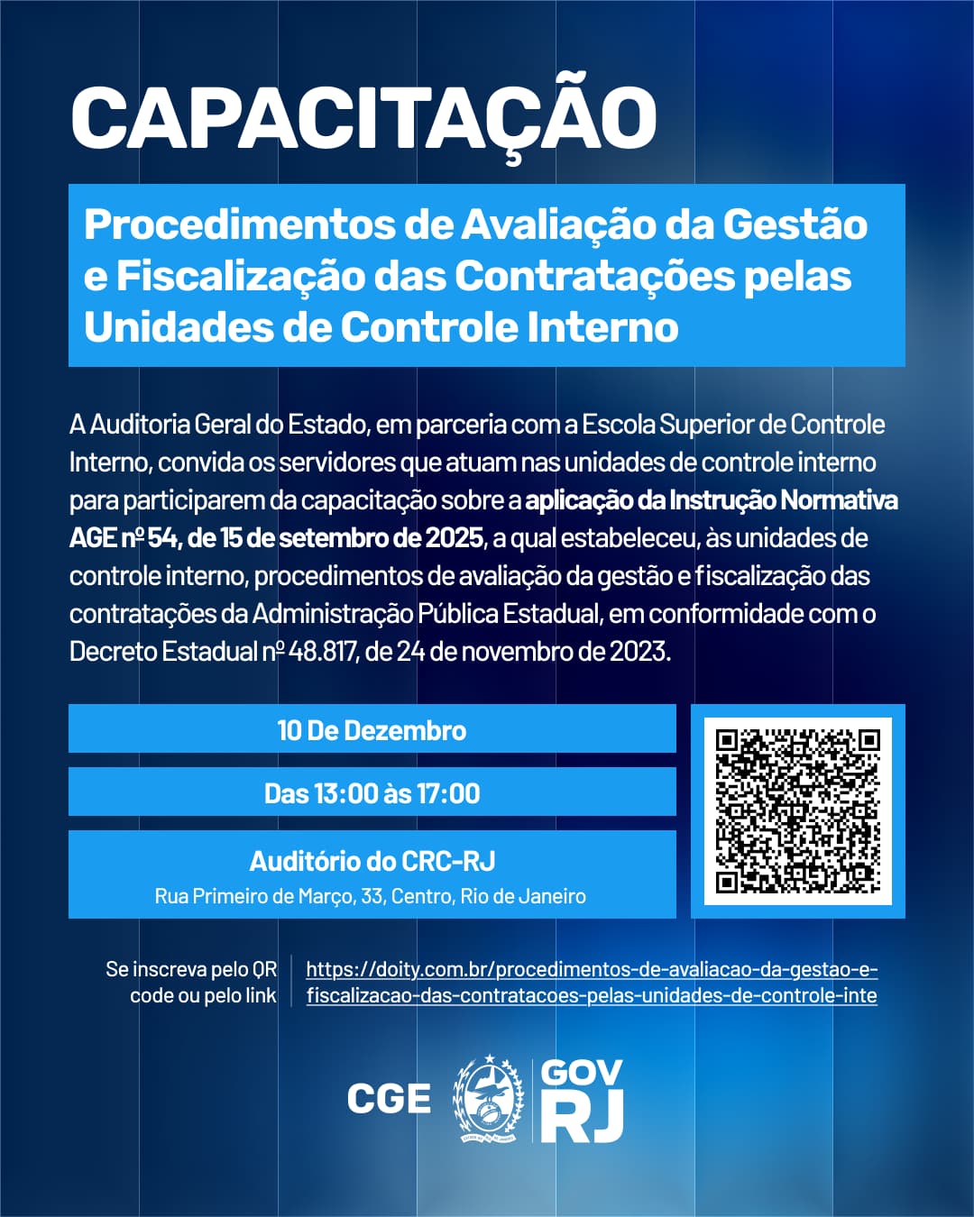 A Auditoria Geral do Estado, em parceria com a Escola Superior de Controle Interno, convida os servidores que atuam nas unidades de controle interno para participarem da capacitação sobre a aplicação da Instrução Normativa AGE nº 54, de 15 de setembro de 2025, a qual estabeleceu, às unidades de controle interno, procedimentos de avaliação da gestão e fiscalização das contratações da Administração Pública Estadual, em conformidade com o Decreto Estadual nº 48.817, de 24 de novembro de 2023.